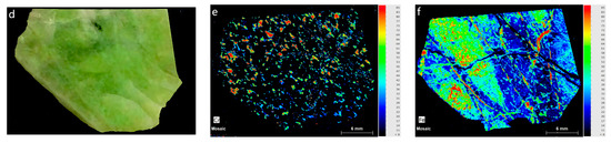To visually observe the distribution of chromogenic elements Cr and Fe in Zibai Jade, polished sections containing emerald-green spots, dark green patches, and fibrous green inclusions were subjected to μ-XRF mapping analysis. Polished sections were prepared from two sample blocks, which were taken from samples ZB-4 and ZB-1, respectively (Figure 8a,d). The scanning results are presented in the figure below (Figure 8b,c,e,f). Combined Cr and Fe elemental distribution maps reveal that the matrix of the jade is nearly devoid of Cr, while Fe is predominantly concentrated in chlorite-rich regions. These observations are consistent with the results obtained from SEM and EPMA. Areas with the highest Cr concentration, indicated by red zones on the map, exhibit distinct point-like distributions that correspond to the emerald-green spots within the jade. Minor Cr enrichment is also observed in chlorite and Cr-bearing grossular, aligning with the distribution of fibrous green inclusions.