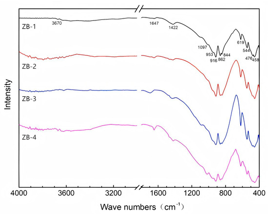 The characteristic infrared absorption bands of Zibai Jade are primarily observed in the regions of 3700–3600 cm−1, 1000–800 cm−1, and 700–400 cm−1 (Figure 9). Compared with the reference infrared spectrum of grossular from the RRUFF database, the sample exhibits a νO-H stretching vibration in the range of 3700–3600 cm−1 and a δO-H bending vibration at 1641 cm−1. These observations are attributed to the presence of structural OH groups in the sample [23,24]. Hydrogrossular has the chemical formula Ca3Al2[SiO4]3−x(OH)4x and belongs to the nesosilicate mineral group. According to previous studies, absorption bands above 500 cm−1 may be related to asymmetric stretching and bending vibrations of SiO4 groups, while bands below 500 cm−1 are primarily influenced by trivalent and divalent cations [25]. The absorption peaks at 1097, 862, and 844 cm−1 are assigned to the νas Si-O-Si asymmetric stretching vibration. The peak at 619 cm−1 corresponds to the ν3Cr-O stretching vibration, that at 544 cm−1 is attributed to the ν2O-Cr-O bending vibration, that at 476 cm−1 is assigned to the ν1Fe-O stretching vibration, that at 458 cm−1 is associated with lattice vibrations (related to Al3+ vibrations) [26,27], that at 3670 cm−1 is attributed to the νO-H stretching vibration [28], and that at 1647 cm−1 corresponds to the δO-H bending vibration. The absorption peak at 1422 cm−1 may be caused by chlorite present in the jade [29]. The infrared spectral characteristics and assignments for the Zibai jade (sample ZB-1) are summarized in Table 5.