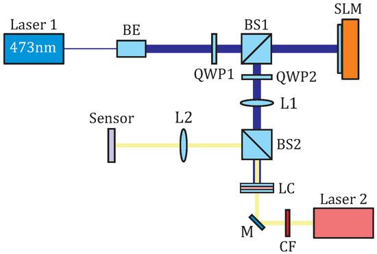 where the matrix is a rotation matrix at the angle , multiplied by the dynamic phase term [7]. To avoid redistribution of the light intensity due to diffraction caused by phase modulation, the sample was placed in the image plane of the SLM screen using lens L1 in a configuration.