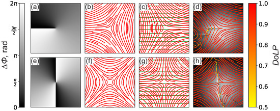By rotating the polarization plane of the pump beam by a variable angle (Figure 2a,e), where is the polar angle in a polar coordinate system, the resulting polarization patterns (Figure 2b,f) exhibit singularities characterized by topological defects with charge Q. For demonstration, we chose the corresponding phase distributions to achieve and .
