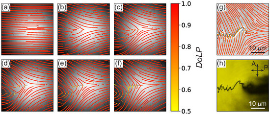 To ensure additionally that the polarization patterns shown in Figure 4b,d are the same for any light wavelength, we used the interference filters at 495 nm, 530 nm, 550 nm, 574 nm, 600 nm, and 641 nm, where the full width at half maximum is ≈10 nm, and calculated the correlation coefficients and DoLP averaged over the region of interest. The correlation coefficient for the tilt angle distribution of the long axes of the polarization ellipses was found to be for both and . At the same time, the degree of linear polarization averaged over the region of interest is for both and , for all wavelengths. The weak depolarization effect can be explained by light scattering in the region of the LC defect.