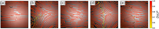 Experimental images of the probe light intensity distributions of the broadband probe beam overlapping with lines visualizing the long axes of the polarization ellipses (the color of the lines corresponds to the degree of linear polarization, DoLP). The image size is 2.6 mm. The pump light, with consequently changed (a–d) polarization patterns with singularities Q = (b) −1/2, (d) −1 and without singularities (a,c,e), was used. The exposure time for each pattern is t = (a) 0 min, (b) 7 min, (c) 7 min, (d) 12 min, and (e) 20 min.