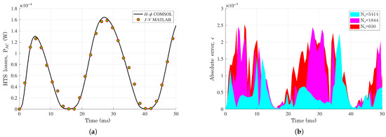Within the time interval , the computed AC losses for the HTS disk are presented in Figure 4, together with the instantaneous absolute error, computed as follows: