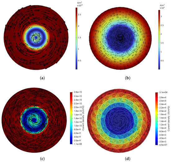 Top view of the current density norm at ms. (a) HTS disk with . (b) Iron substrate with . (c) HTS disk with . (d) Iron substrate with .