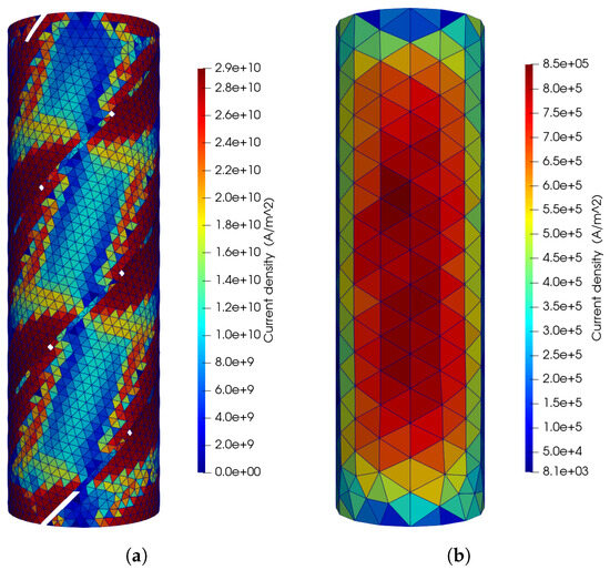 The trend of AC losses due to the HTS material and the Cu within the interval is reported in Figure 7. It can be noticed that the AC losses are comparable in this case due to the high value of the current density induced in the former. A detailed map of the current density in HTS tapes and the former is illustrated in Figure 8 for the time instant ms. The current density in the HTS tapes is predominantly concentrated near their boundaries, consistent with results reported in the literature [39].