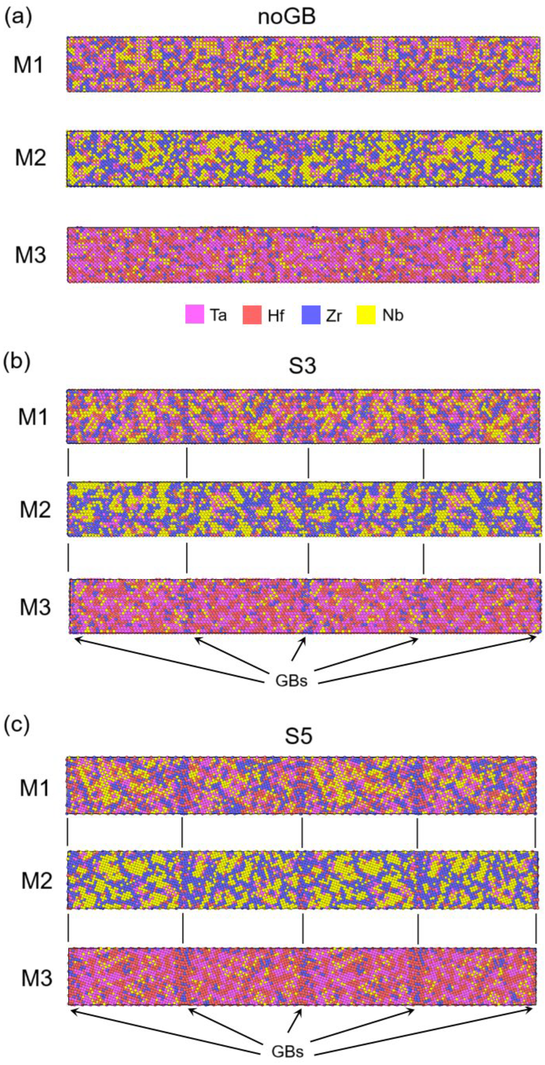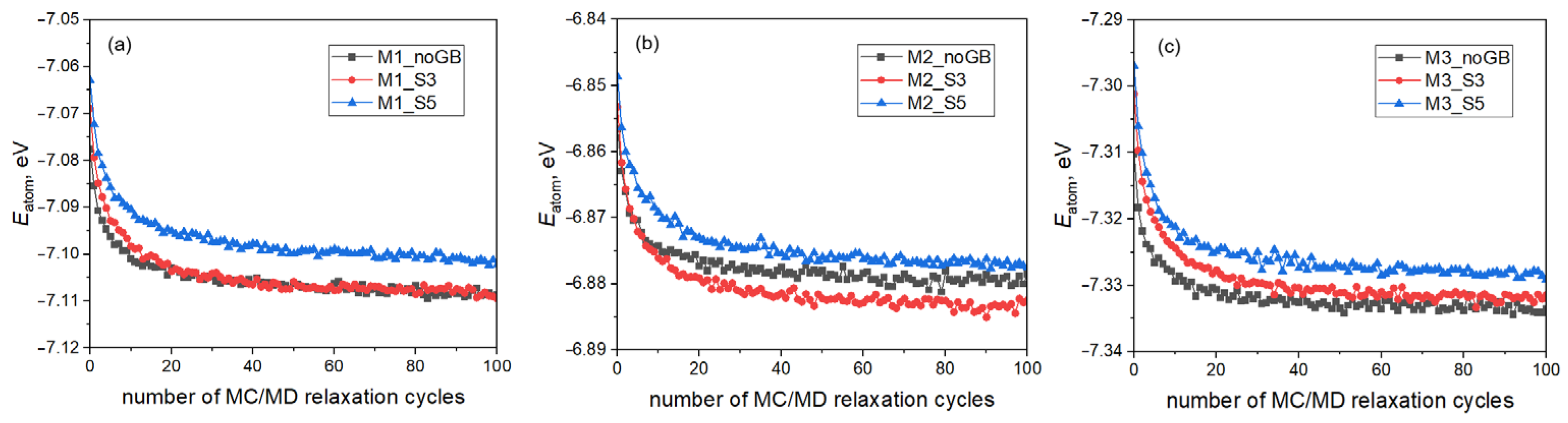 - Farkas, D. Grain boundary structure in high-entropy alloys. J. Mater. Sci. 2020, 55, 9173–9183. [Google Scholar] [CrossRef]