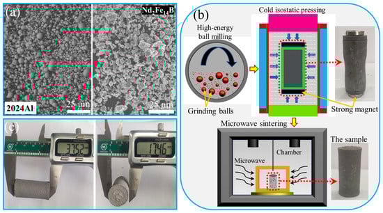 In the present study, 2024Al powder with a purity of 99.99% (average particle size of 10 μm, Changsha Tijo Metal Materials Co., Ltd., Changsha, China) and Nd2Fe14B powder with a purity of 99% (average particle size of Nd2Fe14B powder is about 45 μm, Guangdong Xinnuode Transmission Parts Co., Ltd., Guangzhou, China) were used as the main raw materials, as shown in Figure 1a. First, the 2024Al powder and Nd2Fe14B powder were placed in the planetary ball mill for high-speed ball milling to further refine them into fine and uniform powders. Ball milling was performed using zirconia grinding media with diameter ratios of 15 mm/10 mm/5 mm at 1:2:4 (mass ratio). Anhydrous ethanol was employed as the process control agent. The ball milling was conducted at a rotation speed of 200 r/min for 12 h. After ball milling, the powder was filtered and then placed in a vacuum drying oven, where it was dried at 72 °C for 48 h. The purpose of this process was to obtain submicron-sized 2024Al and Nd2Fe14B powders. Then, the two powders were mixed and ball-milled together. The prepared mixed powder was placed in a drying oven for drying and then subjected to cold isostatic pressing in the magnetic field atmosphere. During the sintering process, based on the previously optimized sintering process, the pressed samples were first heated to 200 °C and held for 5 min. Then, the temperature was increased at a rate of 10 °C/min until 490 °C, and was held for 30 min []. The preparation process of the samples is shown in Figure 1b, and the dimensions of the samples are illustrated in Figure 1c. To achieve the magnetic properties of the composite, the sintered samples were placed in a magnetizing device for magnetization.