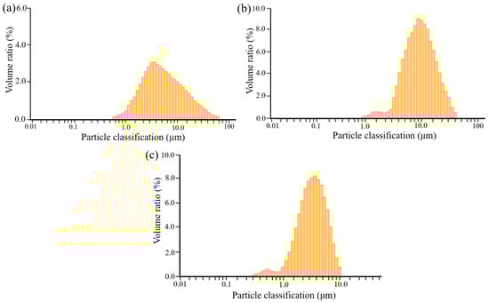 Effect of ball milling time on particle size distribution of composite powder: (a) ball milling time is 6 h; (b) ball milling time is 8 h; (c) ball milling time is 10 h.