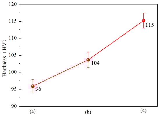 As depicted in Figure 4, the microhardness of the composites increased monotonically with decreasing powder composites and increased monotonically with decreasing powder particle size, peaking at 115 HV for the 5 μm sample. When the powder particle size is large, the Nd2Fe14B particle phase is coarse and distributed in the matrix in an irregular shape with sharp corners (as shown in Figure 3a), which is not conducive to the interface bonding between the reinforcing phase and the matrix. When the average particle size of the powder is 5 μm, the Nd2Fe14B phase is mainly in a nearly spherical shape and distributed relatively uniformly in the matrix, thus making the composite show a higher overall hardness.