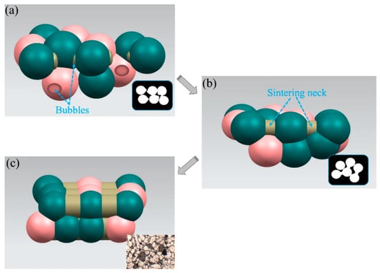 Figure 5 is a schematic diagram showing the densification process of the sample compact during microwave sintering. Figure 5a presents the state of particles inside the compact before the start of sintering, that is, the state after cold isostatic pressing. During the cold isostatic pressing process, migration and deformation occur between particles, leading to an increase in the number of internal defects in the particles. The increase in defects will promote the diffusion of atoms during microwave sintering. Meanwhile, under the high-strength load of cold isostatic pressing, tight bonds are formed between powder particles, which helps to promote the formation of sintering necks between particles during sintering. Figure 5b shows the formation of sintering necks during the sintering process.