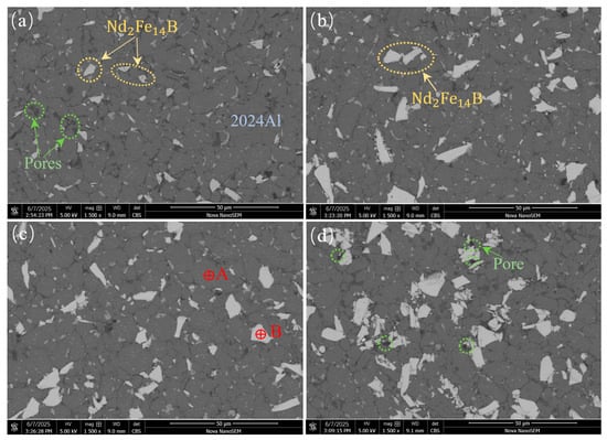 Figure 6a–d show the SEM morphology of Nd2Fe14Bp/2024Al composites with different amounts of Nd2Fe14B added. When the addition is 5 wt.%, the Nd2Fe14B phase is relatively sporadically distributed on the matrix. At this time, the grain size of the matrix is relatively coarse and has poor uniformity, and some pores can be observed in the matrix, as shown in the marked area of Figure 6a. When the addition of Nd2Fe14B reaches 10 wt.% (Figure 6b), the grain size of the 2024Al matrix decreases, and the pores between the grains reduce compared to Figure 6a. The distribution of the Nd2Fe14B phase on the matrix is relatively uniform, but the morphology tends to exhibit irregular and sharp angular shapes. When the addition is 15 wt.% (Figure 6c), compared to Figure 6b, the number of grains with sharp angular morphology has notably decreased, and the distribution in the matrix is relatively uniform, with no obvious aggregation observed. Additionally, the number of visible pores in the matrix has also decreased. When the addition of Nd2Fe14B reaches 20 wt.% (as shown in Figure 6d), the packing density of the Nd2Fe14B particle phase on the matrix is higher, and nearby particles tend to stick together and aggregate []. Meanwhile, it is evident that a larger number of pores are formed at the interface between the Nd2Fe14B phase and the 2024Al matrix, as indicated by the green dashed lines in Figure 6d. Therefore, from the perspective of the microstructure, when the addition of Nd2Fe14B is 15 wt.%, the microstructure of the Nd2Fe14Bp/2024Al composites is more ideal.