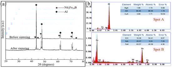 Figure 7a shows the XRD patterns of the composite before and after sintering. It can be seen that no new phases were generated after sintering, as the sintering temperature was 490 °C, which is far below the melting point of Nd2Fe14B (1150 °C) and 2024Al (655 °C). Moreover, the XRD peaks of Nd2Fe14B are consistent with each other, showing no changes or shifts. This indicates that the structure of Nd2Fe14B remains stable during the sintering process, thereby ensuring the magnetic properties of Nd2Fe14B. Meanwhile, no other new phases or oxides are formed in the composite, as the sintering process is carried out under the protection of an argon atmosphere, which effectively inhibits the oxidation of the composite. The EDS spectroscopy (Figure 7b) analysis was conducted on points A and B in Figure 6c, indicating that the compositions are 2024Al matrix and Nd2Fe14B phase, respectively.