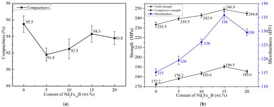 Figure 8a shows the trend of the compactness of the composite as the content of Nd2Fe14B changes. When Nd2Fe14B is not added, the compactness of the 2024Al alloy is approximately 95.5%. However, after adding different amounts of Nd2Fe14B powder, the compactness of the composite first decreases and then increases. As the addition varies at 5 wt.%, 10 wt.%, and 15 wt.%, the compactness of the composite gradually increases, reaching the highest value at the addition of 15 wt.% Nd2Fe14B. As the amount of Nd2Fe14B increases, the thermal effect of the reinforcing phase in the composite during the microwave sintering process becomes more significant, contributing increasingly to the absorption and conversion of microwave energy in the overall heating, and resulting in a more uniform microstructure and refined grains, thus increasing the compactness. However, when the addition of Nd2Fe14B reached 20 wt.%, the mobility of the Nd2Fe14B particles was weakened during the cold isostatic pressure process, leading to aggregation and an increase in the number of gaps between particles [], which subsequently decreases the compactness of the composite.