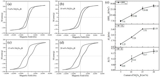 Figure 9a–d show the VSM (vibrating sample magnetometer) curves of composites with different Nd2Fe14B content, which were measured and characterized using an oscillating sample magnetometer to assess the magnetic properties of the materials. The magnetic properties’ parameters of the composite, such as remanence (Br), coercivity (Hcj), and maximum magnetic energy product ((BH)max), can be calculated through the VSM curve, as shown in Figure 9e.