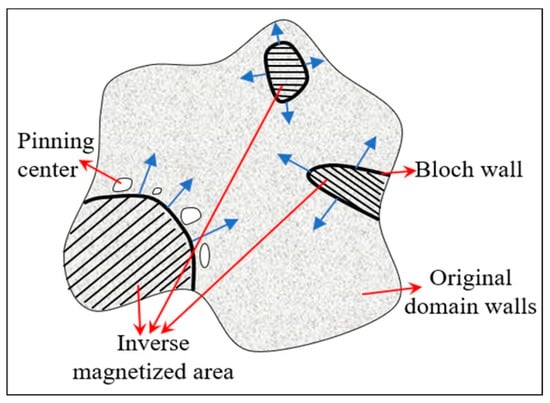 The magnetic properties of the composite are influenced by both the amount of Nd2Fe14B added and the microstructure and compactness. The pores inside the composite and the sharp corners of irregularly shaped particles have low energy barriers. When magnetized, these defects are prone to form uneven and dispersed reverse magnetic fields, leading to the occurrence of the demagnetization phenomenon (as shown in Figure 10) and reducing the magnetic properties of the material []. When the addition amount is 20 wt.%, the Nd2Fe14B particles agglomerate and there are more pores in the microstructure (Figure 6d). These areas can form more reverse magnetic fields during the magnetization process, affecting the exchange coupling between Nd2Fe14B magnetic particles and resulting in a decrease in the overall magnetic properties of the composite.