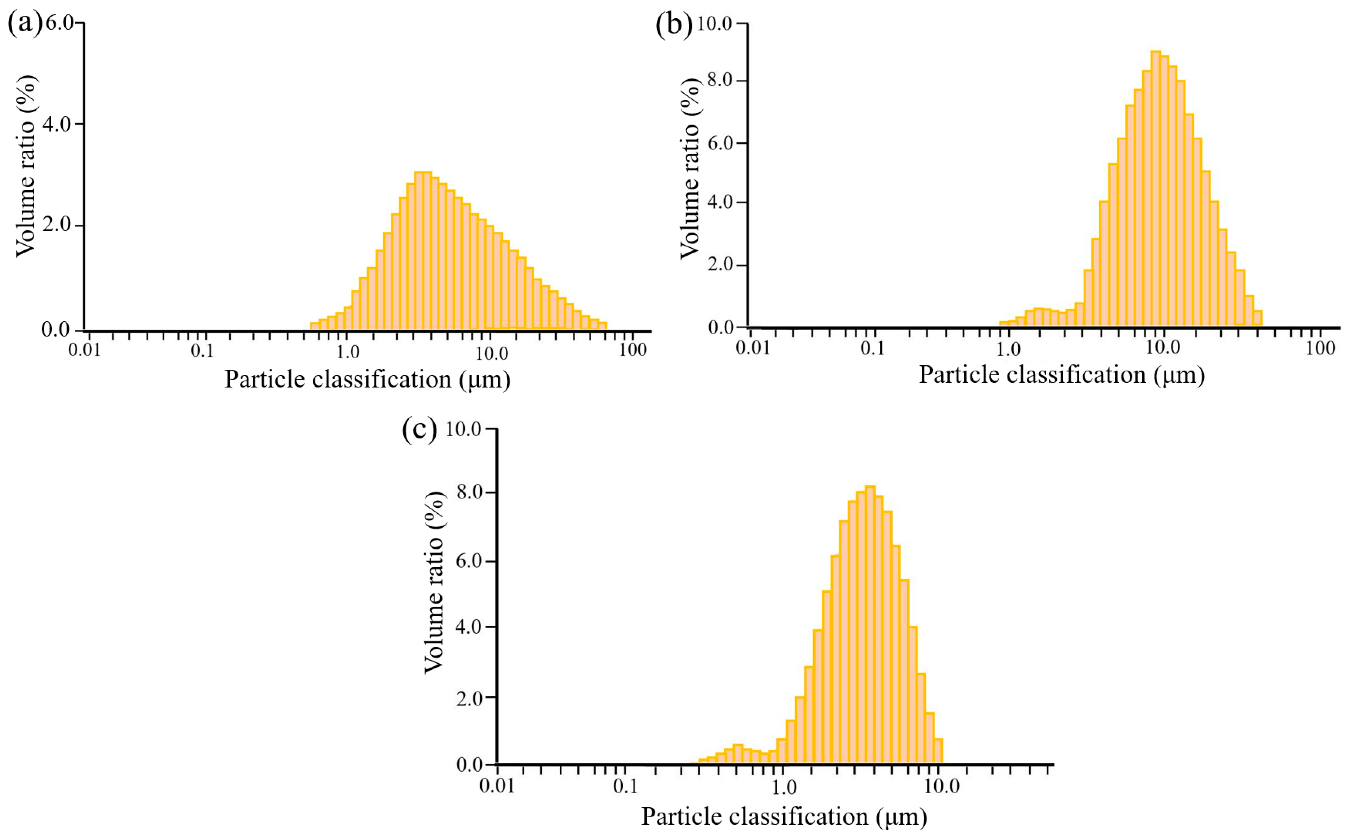 Figure 2a–c show a particle size distribution diagram of the composite mixed powder prepared under different ball milling times. The ball diameter ratio is 1:2:4, the ball-to-powder ratio is 5:1, and the ball milling times are 6 h, 8 h, and 10 h. The average particle sizes of the prepared composite powders are 25 μm, 10 μm, and 5 μm, respectively. When the ball milling time is 6 h, the mixed powder undergoes a relatively short duration, resulting in insufficient mechanical alloying. The coarse particles are not fully impacted and crushed, leading to a larger average particle size of the powder. According to the action principle of microwave sintering on metal particles, powder with such a particle size is not suitable for microwave sintering materials [