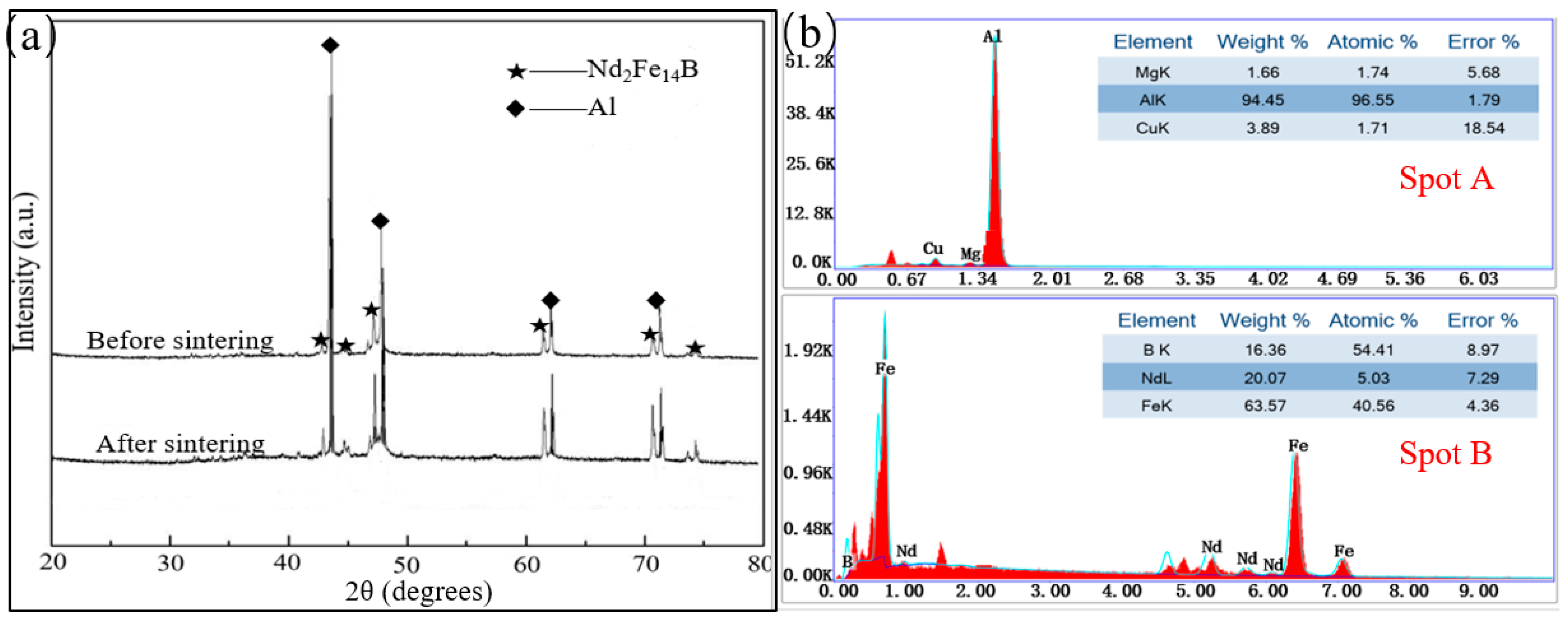 Figure 7a shows the XRD patterns of the composite before and after sintering. It can be seen that no new phases were generated after sintering, as the sintering temperature was 490 °C, which is far below the melting point of Nd