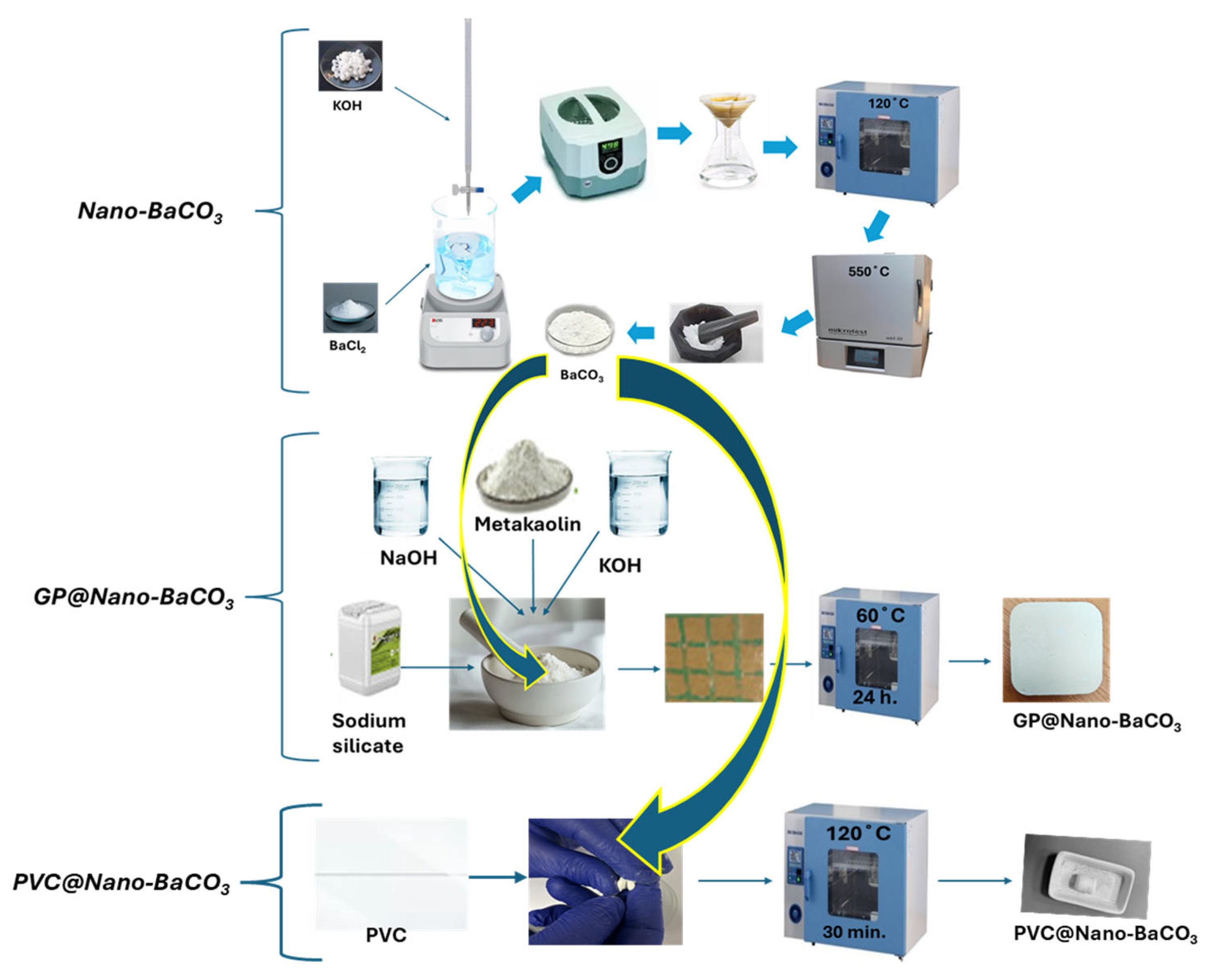 Figure 1. Schematic representation of materials and equipment used for Nano-BaCO3, GP@Nano-BaCO3, and PVC@Nano-BaCO3 synthesis.