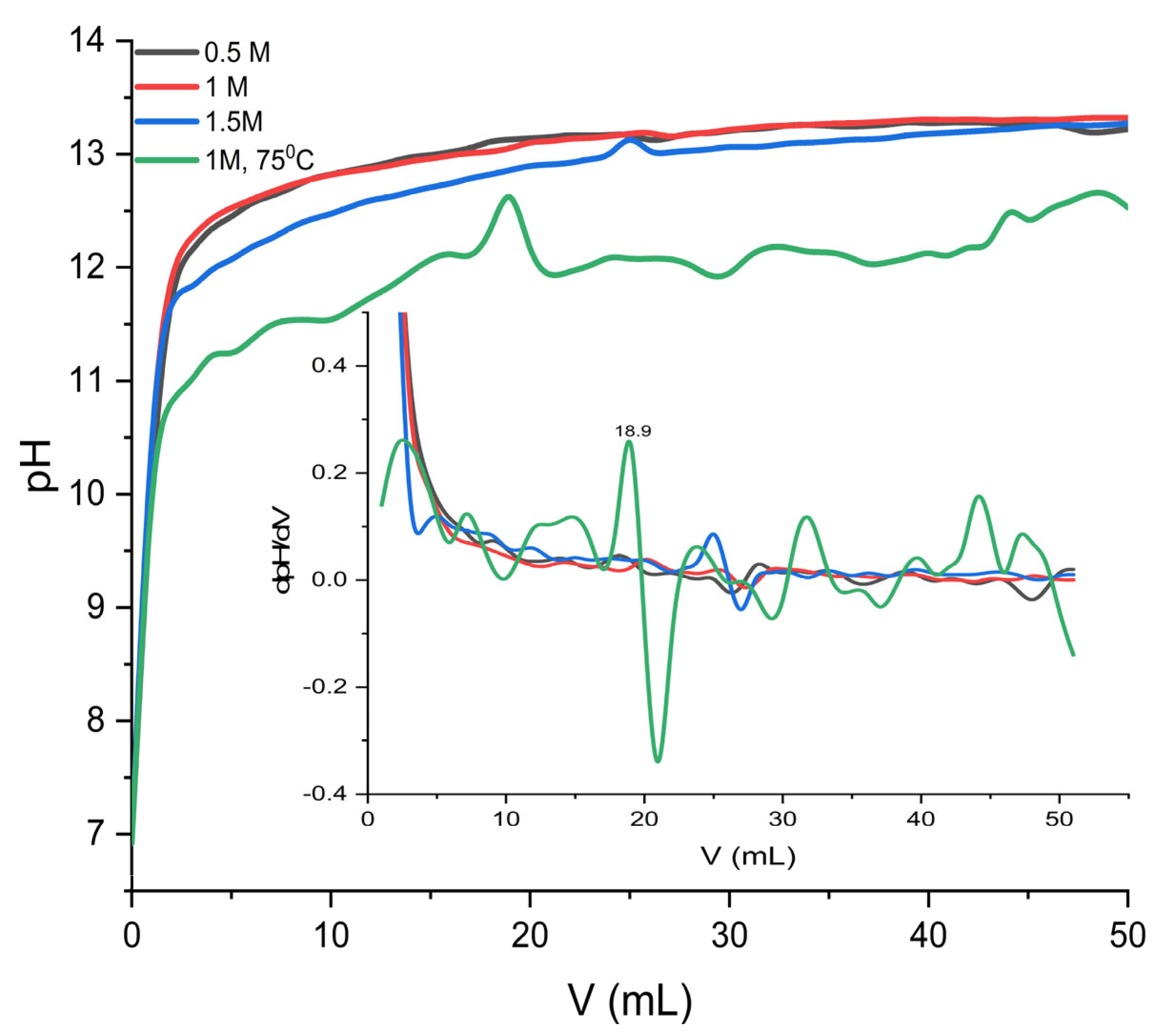 The dpH/dV derivative shows low and steady values, characteristic of a controlled reaction, with the gradual formation of the solid phase. In contrast, the sample synthesized at 75 °C exhibits a distinct behavior: the lower initial pH ~10.32 (after addition of 1 mL KOH) increases slowly and unevenly, and the dpH/dV curve shows wide fluctuations and a pronounced maximum around 18.9 mL. This peak indicates a sudden stage of nucleation and the accelerated growth of crystallites. This behavior is attributed to a combination of the decrease in pKw with temperature, the change in carbonate equilibria, and the intensification of gas–liquid mass transfer.