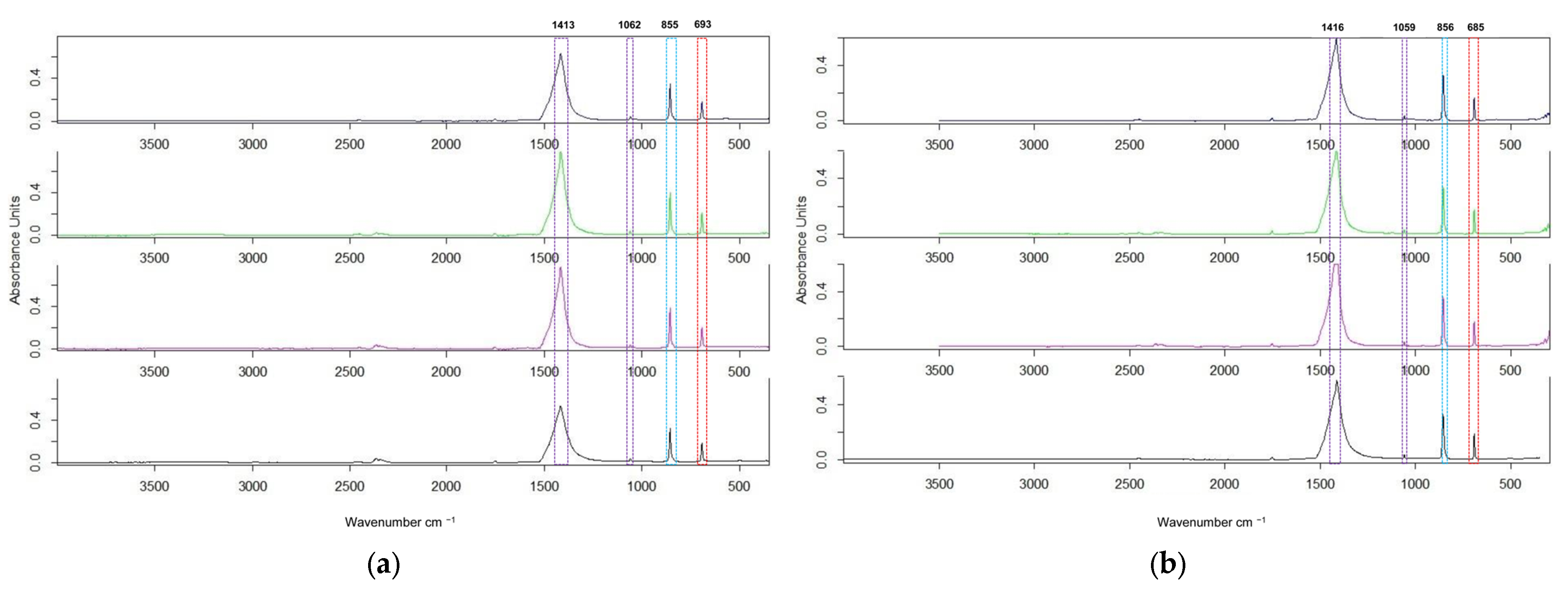 Figure 3. ATR-FTIR spectra of Nano-BaCO3/0.5 (gray); Nano-BaCO3/1 (green); Nano-BaCO3/1 (violet); and Nano-BaCO3/1/75 (black): (a) before and (b) after calcination at 550 °C.
