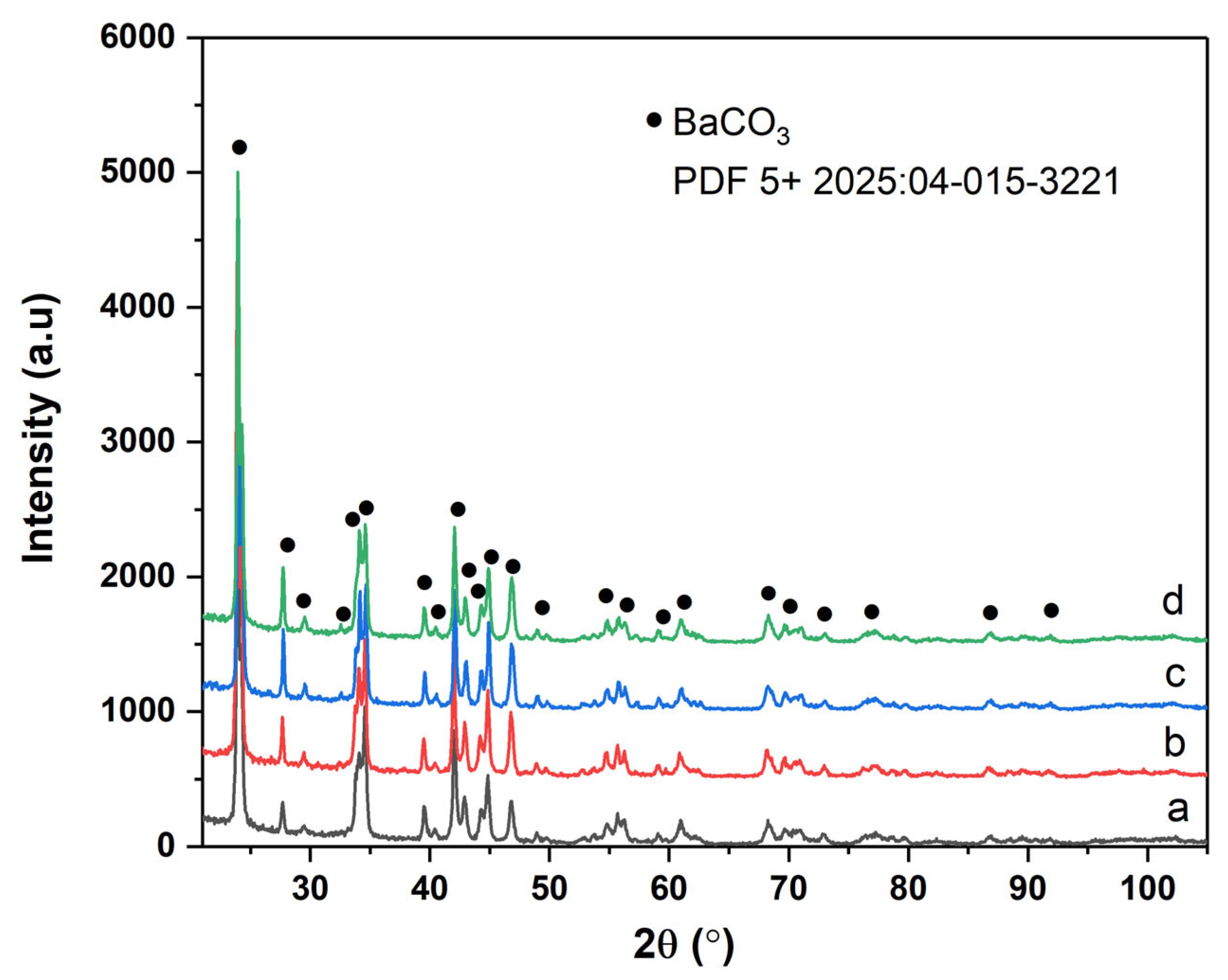 BaCO3 has recently attracted interest as a photocatalyst active under visible light, exhibiting a band gap of approximately 3.3 eV and high efficiency in the degradation of organic dyes, e.g., Crystal Violet, with yields up to 91% under optimal conditions [4]. The photocatalytic mechanism is based on the generation of electron–hole pairs, followed by the formation of reactive oxygen species (•OH, O2•), which determine the mineralization of pollutants. Compared to TiO2, a reference standard with a band gap of ~3.2 eV, which is doping-dependent for the extension into the visible region, and ZnO, comparable in terms of band gap, BaCO3 demonstrates an intrinsic sensitivity to visible light and good recyclability associated with stability and low cost [4,5,6,7].