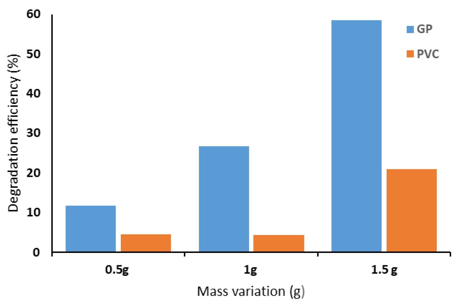 Figure 7. Degradation of MB (%) with various masses with GP/PVC under dark conditions.