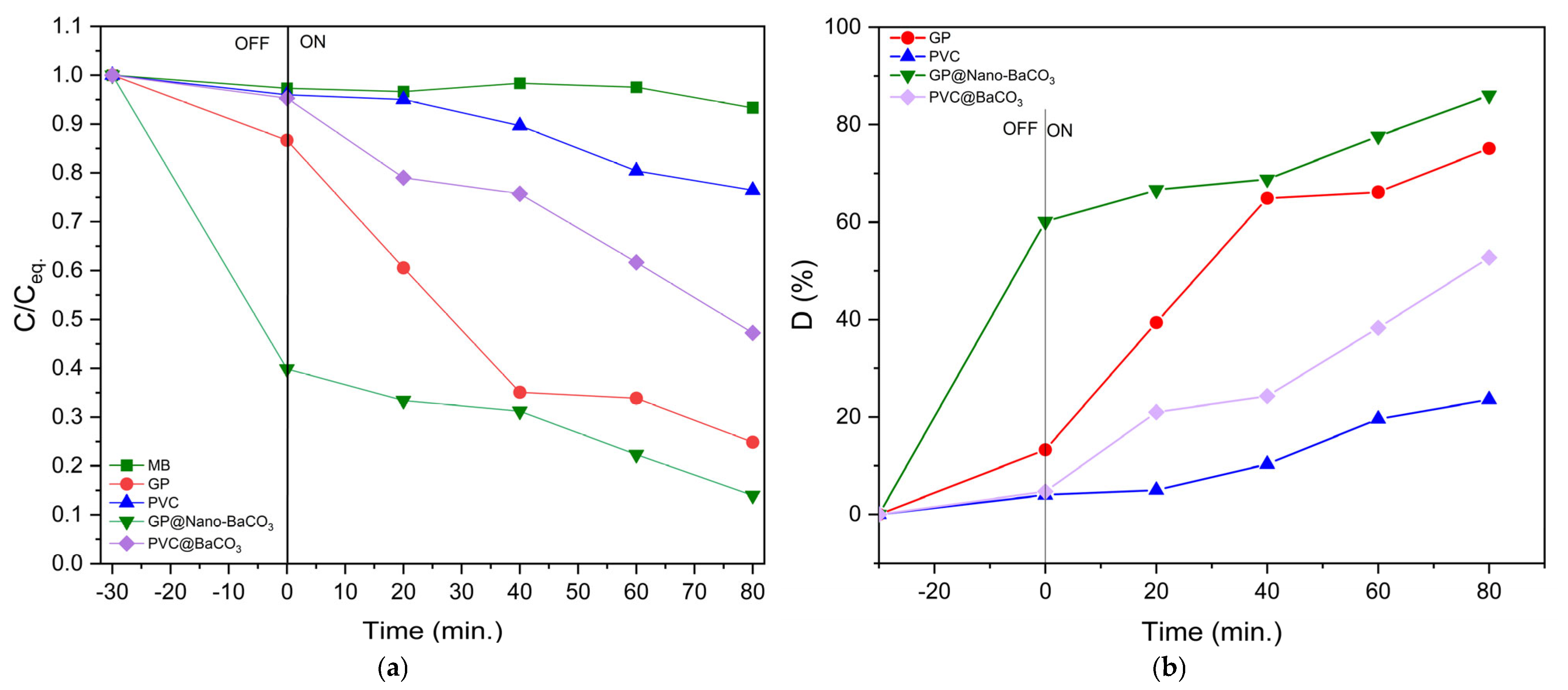 Figure 8. (a) Variation in C/Ceq with time and (b) degradation of MB incubated with GP, PVC, GP@Nano-BaCO3, and PVC@Nano-BaCO3 under sun conditions.