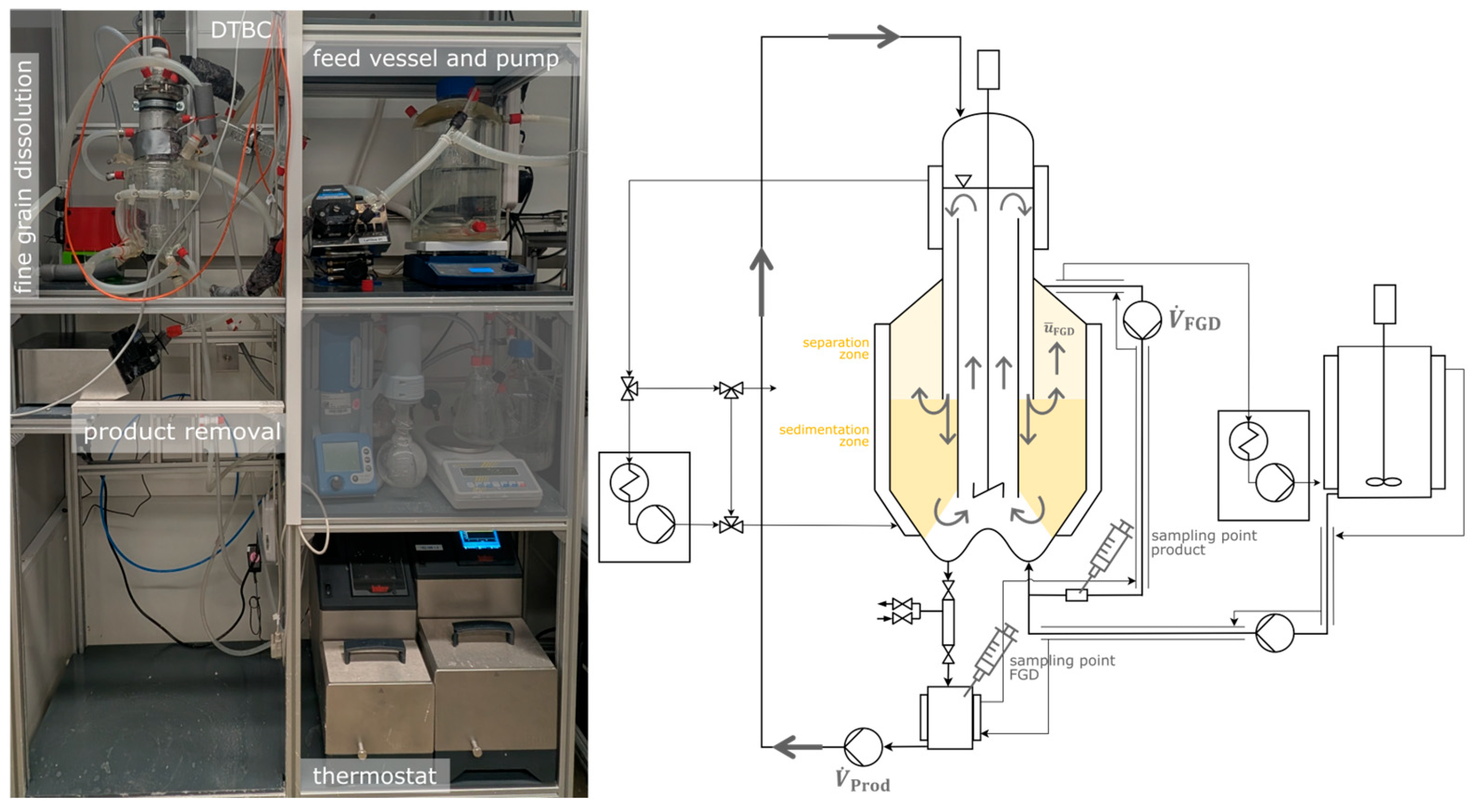 32]. The implementation of evaporation crystallization in a lab-scale DTBC is hampered by the FGD functionality. Further heating of the suspension in the FGD through the heat exchanger can cause unwanted evaporation of the solution in the FGD, potentially leading to uncontrolled crystallization. Adding geodetic height to the FGD increases the local pressure in the FGD and, consequently, the boiling point. This prevents evaporation in the FGD and creates a small operating window for the dissolution of fine grain in the FGD in a lab-scale DTBC [