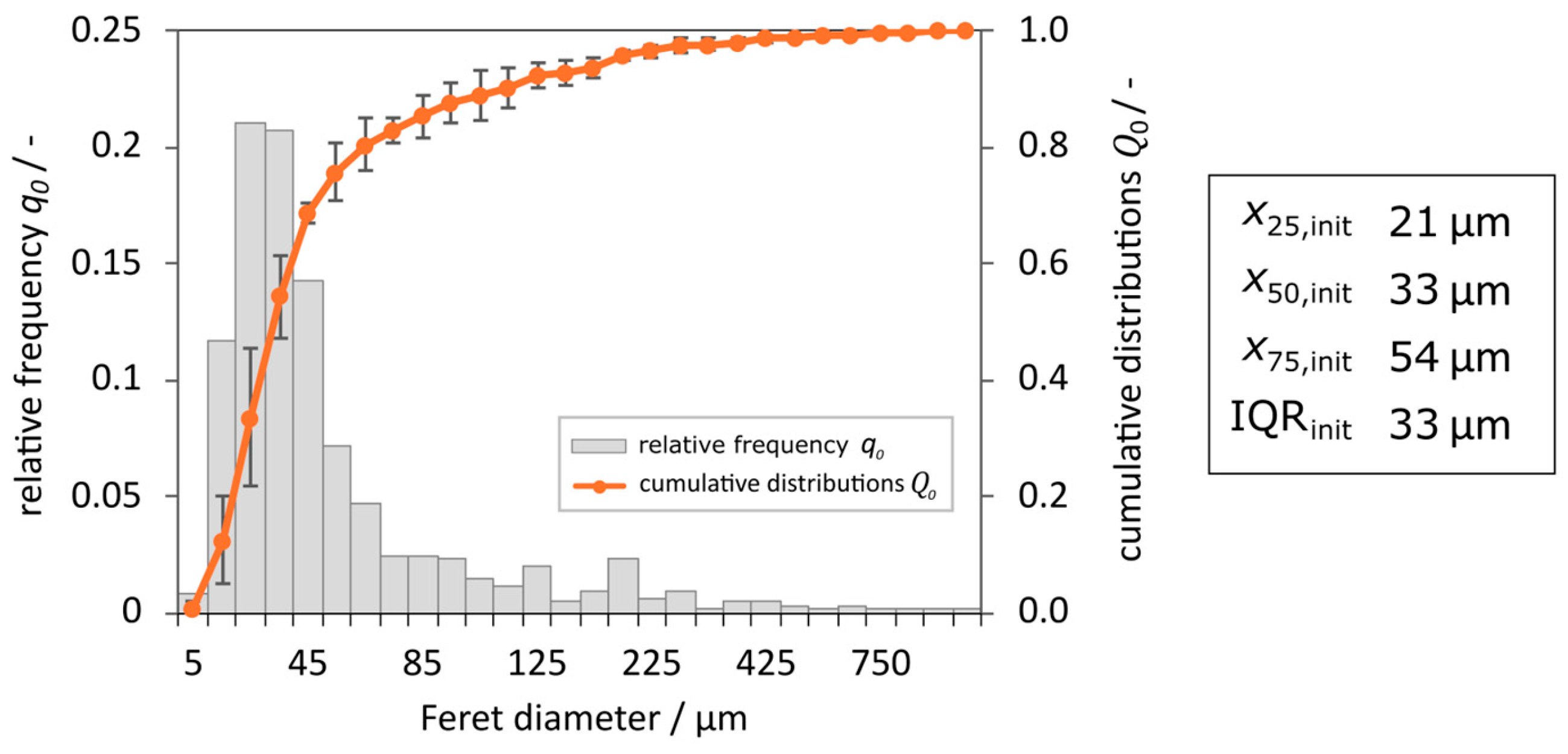 For CSDProd, the expected classification effect of an DTBC is recognizable in the significant increase in statistical values across all operation points compared to CSDinit. The values of x25,Prod are above 100 μm and thus significantly above all values of x75,init. The values of x50,Prod are above 170 μm and for x75,Prod at least above 300 μm.