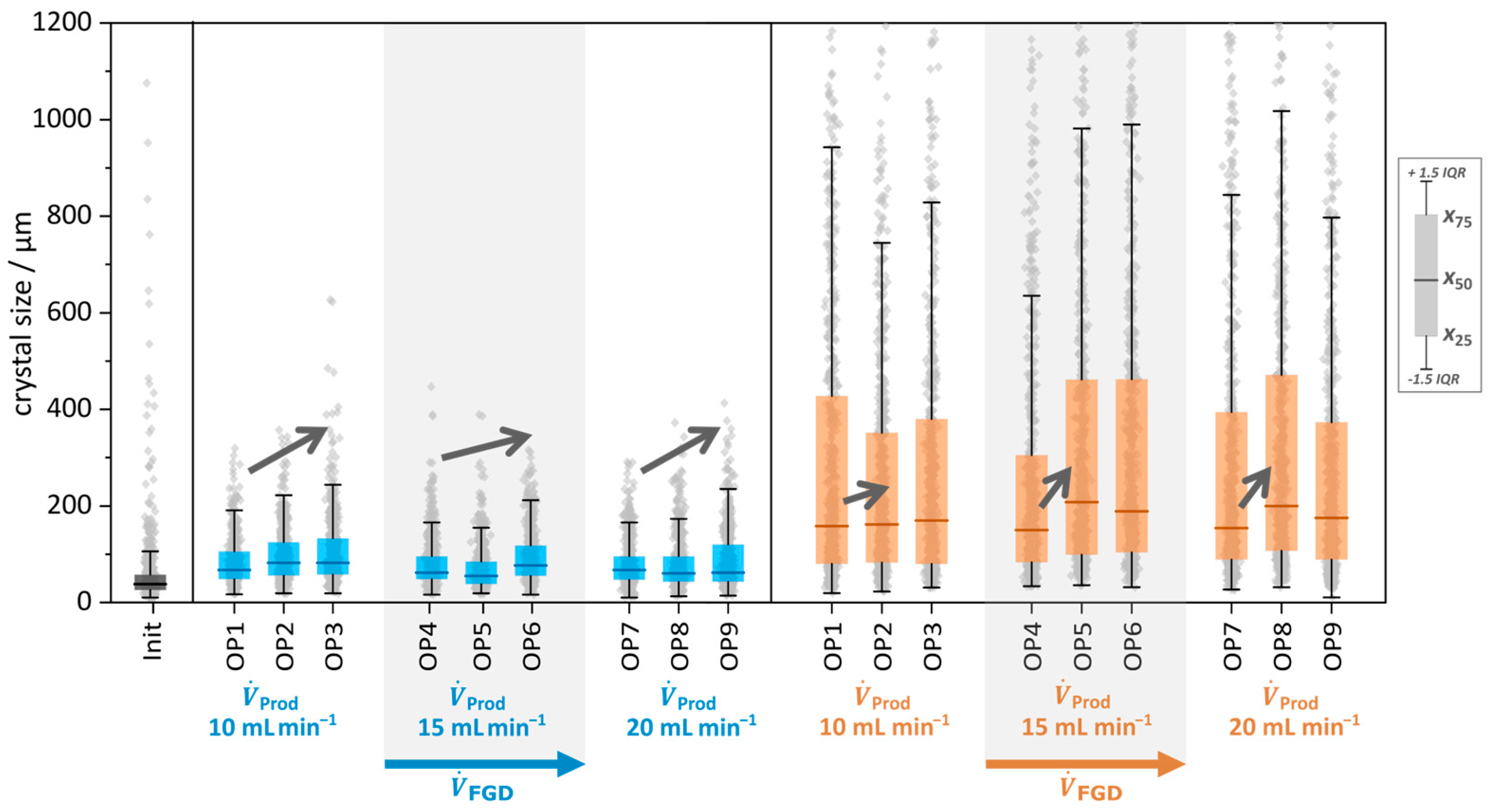 x75,FGD = 130 µm are reached. Additionally, the whiskers and outliers of the boxplots show that crystals with a crystal size > 400 µm were counted in CSD