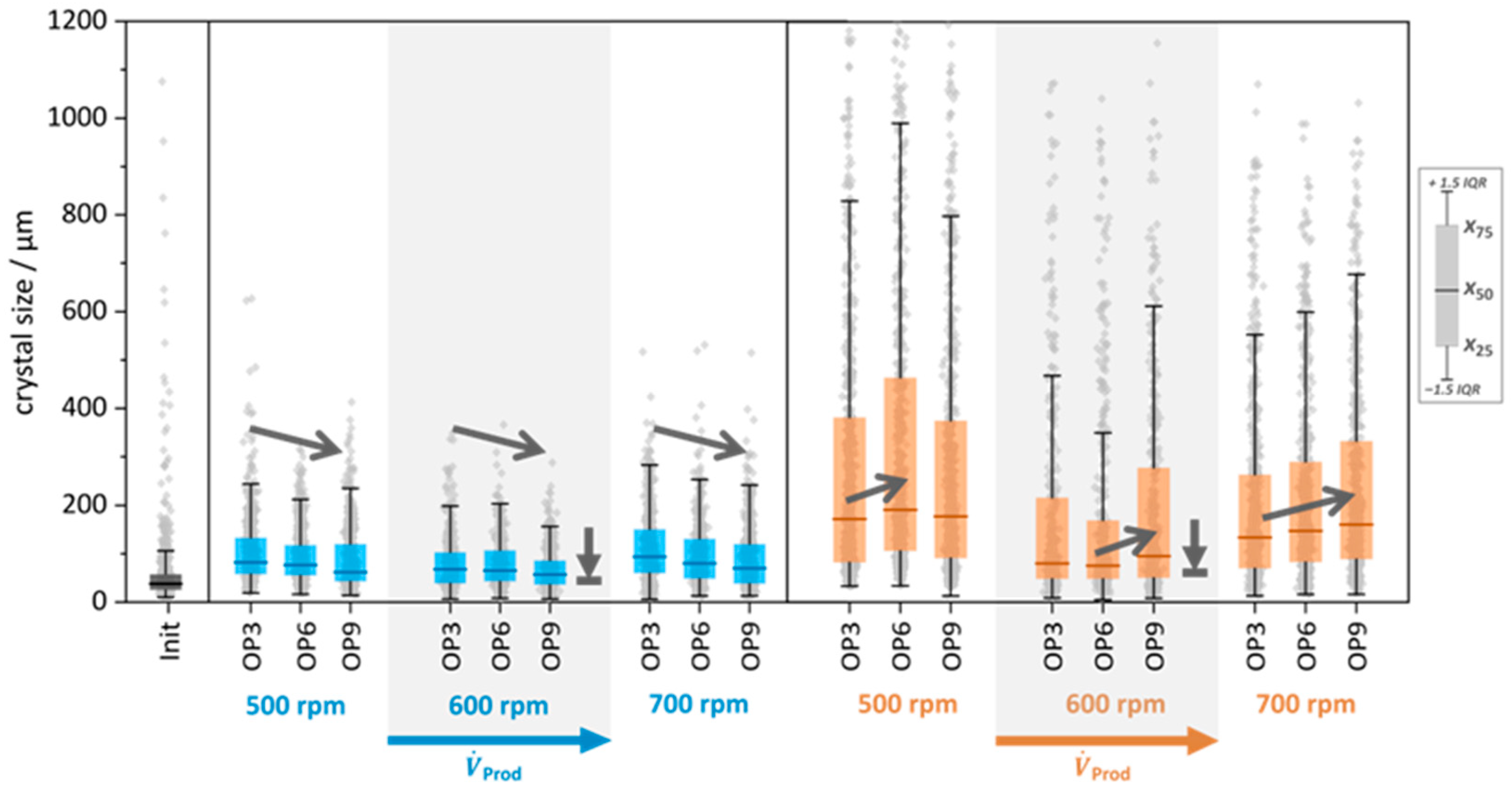 By comparing the influence of the stirring speed on the classification, it can be seen, that for a stirring speed of 700 rpm, the values of x50,Prod are between 150–170 μm and x75,Prod between 250–350 μm, which is significantly lower than the values at a stirring speed of 500 rpm, where x50,Prod is between 180–200 μm and x75,Prod are between 380–440 μm. However, the most pronounced decrease in statistical values is observed at 600 rpm. For this stirring speed, the values of x50,Prod are between 100–120 μm and for x75,Prod between 170–240 μm. One possible explanation for the decrease in CSDProd at higher stirring speeds is a change in the height of the zones within the DTBC.