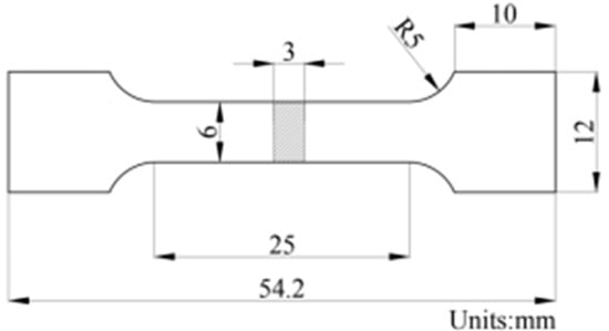 Tensile tests were conducted at room temperature using a CMT6305-300KN universal testing machine (SUST, Xi’an, China) at a constant crosshead speed of 1 mm/min to determine the yield strength (YS), ultimate tensile strength (UTS), and elongation (EL) of the alloys. The tensile test specimen geometry is illustrated in Figure 1. To ensure accuracy and reproducibility, tests were performed in triplicate. Micro-Vickers hardness measurements were carried out on the alloy surfaces using an HVS-1000Z hardness tester (Cossim, Shanghai, China) under a load of 200 gf with a dwell time of 10 s. Twenty indentations were performed for each sample, and the average hardness value was calculated after excluding the highest and lowest measurements. All experimental data were processed and analyzed using Origin 2024.