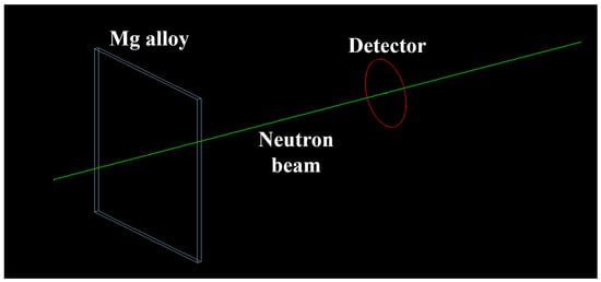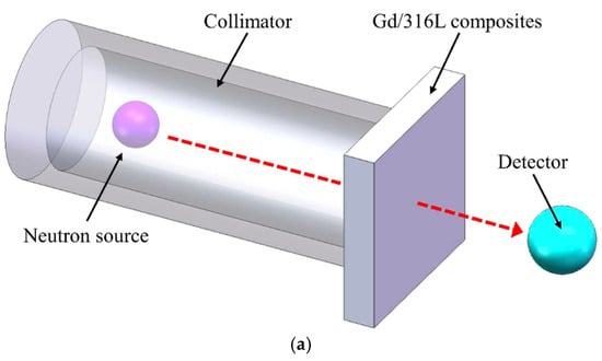 The simulations were carried out using Geant4 10.04, an open-source Monte Carlo toolkit widely employed for modeling the interaction and transport of particles through matter. It enables the configuration of diverse physical models to simulate the behavior of various types of particles and their interactions with materials. In cases where experimental studies are infeasible due to high costs or extended durations, alternative approaches such as Geant4 simulations provide an effective means to circumvent experimental limitations, reduce time requirements, and improve the accuracy of results. This toolkit is extensively used across multiple disciplines including high-energy physics, medical applications, nuclear energy, radiation protection, and space science [30]. The simulation model is simplified based on the actual neutron shielding experiments, as shown in Figure 3. The neutron beam emitted by the defined particle gun in the simulation is unidirectional and perpendicular to the alloy, with an energy spectrum referenced from the neutron energy spectrum in Figure 2b. In the simulation, the alloy composition and density are precisely defined, and a virtual uniform material is constructed using the built-in functions in Geant4 based on the specified elemental composition and density. A detector is set up to record the number of neutrons passing through the alloy sample. Additionally, key physical models and processes need to be set in the simulation, including hadronic interactions, neutron capture, neutron scattering, and electromagnetic processes. By comparing the number of neutrons emitted from the neutron source with the number of neutrons detected by the detector after passing through the material, the neutron shielding efficiency and linear attenuation coefficient are obtained.