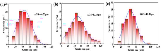 Grain size distribution of Mg alloys: (a) DS1, (b) DS2, and (c) DS3.