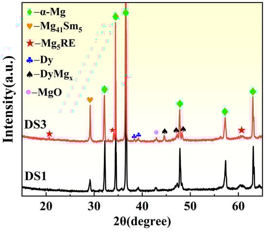Figure 7 presents the XRD spectra of the DS1 and DS3 alloys. The results indicate that, in addition to the α-Mg matrix, the samples primarily contain Mg5RE phases, Dy-rich phases, and Mg41Sm5 phases, along with trace amounts of impurity phases. Due to the smaller size of the secondary phases compared to the matrix, their diffraction peak intensities are relatively weaker. When the Sm content is 1%, it is difficult to observe secondary phases at the grain boundaries in the microstructure, with only a small amount of particle-like secondary phases dispersed within the matrix. As a result, the peak intensities of Mg5RE and Mg41Sm5 in the XRD pattern are both weak. Upon comparison of DS1 and DS3, it can be observed that as the Sm content increases, the peak intensities of Mg5RE and Mg41Sm5 strengthen. The increase in the intensity of the Mg5RE phase suggests that the addition of Sm promotes the precipitation of the Mg5RE phase. This is attributed to the fact that Dy, as a Y-group rare earth element, and Sm, as a Ce-group rare earth element, reduce each other’s solid solubility in α-Mg, thereby promoting the precipitation of rare earth compounds [34]. Consequently, the number and size of the bone-like secondary phases precipitated at the grain boundaries increase, which results in the enhanced diffraction peaks of Mg5RE and Mg41Sm5 in the XRD pattern.