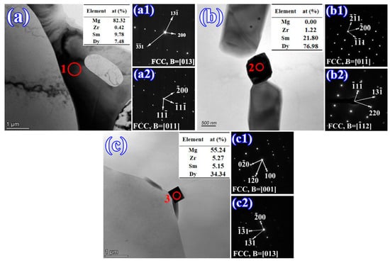 Selected area electron diffraction (SAED) was used to identify the crystal structure of the secondary phases (Figure 9). Micro-area point analysis was conducted within these regions to determine their chemical composition. At point 1, the Mg-to-RE atomic ratio was approximately 5:1, and the corresponding electron diffraction pattern was indexed to a face-centered cubic (FCC) structure. Thus, the bone-like phase was determined to be an FCC-structured Mg5RE phase with a composition of Mg5(Sm0.57Dy0.43). At point 2, the Dy-to-Sm atomic ratio was about 4:1, and no Mg was detected, suggesting a rare-earth-based secondary phase. At point 3, the Mg-to-Dy atomic ratio was close to 2:1, indicating the presence of an FCC-structured Mg2Dy phase, in which small amounts of Sm and Zr were dissolved. Composition analysis of the secondary phases reveals that, with the co-addition of Sm and Dy, rare earth elements not only dissolve into the α-Mg matrix but also mutually dissolve into various secondary phases. The Mg41Sm5 phase, though detected by XRD, was not clearly identified in the TEM analysis. Previous studies have indicated that this phase tends to segregate at grain boundaries and also exhibits a bone-like morphology [35,36,37]. It is therefore inferred that Mg41Sm5 coexists and mixes with the Mg5RE phase. Due to its relatively low abundance and morphological similarity, distinguishing it from the Mg5RE phase under TEM remains challenging.