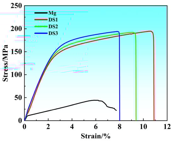 The as-cast alloys with a nominal composition of Mg-12Dy-xSm-0.4Zr (in mass fraction, wt.%), where x = 1, 2, and 3 wt%, were designed and are hereafter referred to as DS1, DS2, and DS3, respectively. The experimental materials were prepared from pure Mg ingot (99.95%) and Mg–30Dy, Mg–30Sm, and Mg–20Zr master alloys. Melting was conducted in an electric resistance furnace using a heat-resistant low-carbon steel crucible under a protective atmosphere consisting of 99% CO2 and 1% SF6. Subsequently, after an isothermal holding time of 10 min, the molten mixture was poured into a steel mold preheated to 400 °C. In order to compare the effects of adding rare earth elements, the smelting experiment also used pure magnesium ingots to undergo the same smelting process for pouring to obtain the cast pure magnesium, and then conducted subsequent performance tests as well. The actual contents of rare earth elements in the alloys were verified by inductively coupled plasma (ICP) analysis. The results, summarized in Table 1, confirm that the measured compositions are consistent with the designed values. Using Archimedes’ principle of displacement, the densities of the three alloys were measured to be 1.88, 1.90, and 1.92 g/cm3.