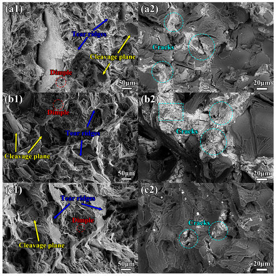 The tensile fracture morphology of the alloy: (a1,a2) DS1, (b1,b2) DS2 and (c1,c2) DS3.