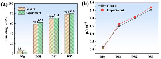 Figure 14 presents the experimental and simulated results of the thermal neutron shielding rate and linear attenuation coefficient for samples with dimensions of 150 mm × 150 mm × 6 mm. Denoting the number of incident neutrons as N0 and the number of neutrons recorded by the detector as N1, the shielding rate is calculated as follows: