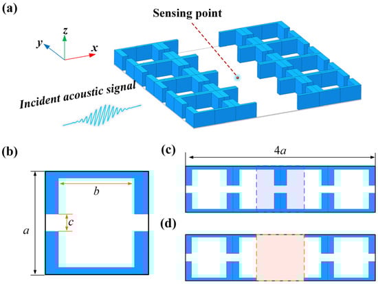 To achieve directional enhancement of incident acoustic signals, this paper proposes a periodically distributed anisotropic line-defect PnC structure, as shown in Figure 1a. Based on the design principles of anisotropic PnCs [42,43], the unit cell was designed with a penetrating rectangular cavity and straight channels. Meanwhile, in consideration of structural fabrication and application constraints, the key geometric parameters were designed as follows: lattice constant a = 60 mm, inner rectangular cavity length b = 44 mm and straight channel width c = 10 mm, as shown in Figure 1b. The white region corresponds to air, characterized by a mass density of ρair = 1.21 kg/m3 and a sound velocity of cair = 343 m/s. Considering structural practicality and manufacturability, photosensitive resin (blue regions in Figure 1b) was selected with material properties: with the mass density ρ1 = 1050 kg/m3, sound speed c1 = 2540 m/s, Young’s modulus E1 = 5.08 GPa and Poisson’s ratio μ = 0.35, respectively. By periodically arranging structures in the x and y directions, one may obtain an ideal two-dimensional square lattice perfect PnC. Figure 1c illustrates a 4 × 1 perfect supercell. As depicted in Figure 1d, removing the two central columns of the perfect supercell (blue shaded region in Figure 1c) induces a line-defect cavity (orange shaded region in Figure 1d), thereby generating Anderson localization effects for acoustic energy [44].