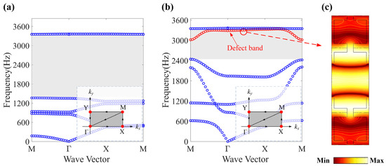 As a result, the complete band structure of the structure can be obtained by solving the dispersion relation between the wave vector k and angular frequency ω in Equation (4). The finite element analysis software COMSOL Multiphysics 6.2 was utilized to compute the band structures of the perfect PnC supercell and the line-defect PnC supercell within the first IBZ, and these results are illustrated in Figure 2a,b. In the perfect PnC, an initial band gap exists within the frequency range of 1360 Hz to 3360 Hz (grey region in Figure 2a), indicating that sound waves within this range cannot propagate through the PnC structure. Introducing defects alters the original band gap profile, resulting in new band gaps and generating a defect band near 3324 Hz. This physical phenomenon enables the confinement of evanescent waves within the defect core and adjacent regions, achieving acoustic energy localization as depicted in Figure 2c. Typically, when using defect PnC for acoustic signal detection, the sound pressure signal at the center point is primarily measured to obtain the local sound pressure within the defect PnC. In actual experiments, micro-electro-mechanical system (MEMS) acoustic sensing units can be employed for measurement. This unusual physical property can be harnessed to boost the detection of acoustic signals, in turn enhancing the capabilities of sensing and manipulating sound waves.