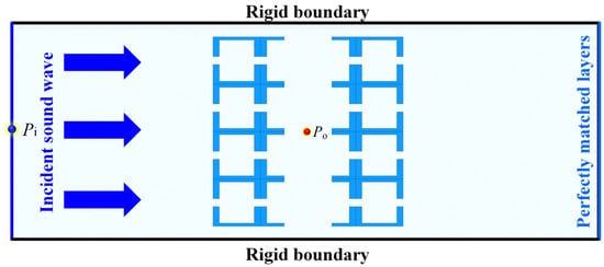 To accurately characterize the acoustic transmission properties of the designed line-defect PnC, the acoustic analysis module of COMSOL Multiphysics was used to establish a computational analysis model for the structure, and theoretical numerical calculations were performed on the transmission of the line-defect PnC structure. It should be noted that considering the application scenario of the designed line-defect PnC, where sound waves propagate along the x and y planes (parallel to the structure surface), a Two-dimensional (2D) simulation model was adopted in this study, as illustrated in Figure 3. The 2D model not only enables analysis of the propagation characteristics of the PnC but also significantly reduces computational complexity. This approach has been widely applied in PnC transmission calculations [31,33,39]. In the acoustic transmission calculation model, the incident plane wave propagates from left to right, the amplitude P0 is set to 1 Pa, and the incident angle α is 0°. Given that the material impedance of this structure is significantly higher than that of air, its boundary is defined as a hard acoustic boundary. Additionally, the top and bottom boundaries are configured as rigid boundaries to generate ideal plane waves. Meanwhile, the right boundary is designated as a perfectly matched layer boundary to absorb unwanted acoustic reflections.