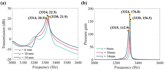 It should be noted that the designed line-defect PnC structure has narrow channels, and acoustic viscous effects must be taken into account to obtain more accurate numerical solutions for acoustic propagation. We employed the boundary layer impedance method [51,52] to simulate the dissipative effects arising from acoustic viscous forces at all boundaries of the line-defect PnC. To obtain the optimal gain structure, we calculated the sound pressure transmission power spectrum and pressure gain spectrum of the line-defect PnC for different straight channel widths c, with results shown in Figure 4a,b. The results indicate a maximum gain resonance peak near 3324 Hz, corresponding to the band frequency of the structural line defect. It has a transmission power exceeding 24.5 dB and a sound pressure gain exceeding 176.9 times. Therefore, considering the optimal balance between sound pressure gain and structural dimensions, we selected a straight channel width of c = 10 mm.