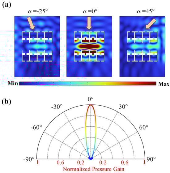 To further validate the directional acoustic enhancement capability of the structure, the directional response of the designed line-defect PnC was calculated under varying incident angles α at its resonant frequency of 3324 Hz. Figure 5a presents the absolute sound pressure distributions for three incident angles (α = −25°, 0°, and 45°). It is observed that at α = 0°, the maximum sound pressure is localized at the center of the line-defect PnC. In contrast, waves incident at other angles (e.g., −25° and 45°) exhibit significant attenuation and become undetectable. The normalized sound pressure gain directional response of the structure was calculated and plotted in Figure 5b. The response curve demonstrates a maximum gain at normal incidence (α = 0°) with no observable sidelobe interference. It is worth mentioning that compared to PnCR with equivalent functionality (exceeding 15 dB in transmission power and achieving over 35 times sound pressure gain) [31], the structure designed in this study has a transmission power that is 9 dB higher and a sound pressure gain that is 141 times higher, without the need for complex coupled resonators. This advantage stems from the simplified structural design, which reduces the thermoviscous dissipation of acoustic energy, thereby effectively addressing the high complexity issue commonly faced by high-performance defective PnCs. These theoretical results confirm that the designed line-defect PnC possesses exceptional directional acoustic enhancement properties, establishing it as a high-gain directional acoustic sensing structure.