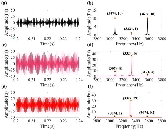 Figure 6a,b show the time-domain and spectrum results of the incident harmonic signal Sh(t) propagating in free space, respectively. Analysis reveals that compared to interference signals from other incident directions, the amplitude of the target sound source at 3324 Hz in the desired direction is extremely weak. However, when detected using the designed line-defect PnC structure, as shown in Figure 6c, the weak harmonic component in the target direction is amplified from an initial 1 Pa to 36 Pa due to the directional enhancement property of this structure. Concurrently, as shown in Figure 6d, interference signals from the other two directions, falling within the structure’s bandgap range, experienced significant suppression of their propagated energy. Their amplitudes decreased from 10 Pa to 8 Pa and 3 Pa, respectively. Additionally, to clarify the distinction between this anisotropic property and the bandgap characteristic, this study constructed a signal Sg(t) with the same frequency as Sh(t) but with an incident angle of 0°. This signal was then detected by the line-defect PnC, with the results shown in Figure 6e,f. Comparing Figure 6d,f reveals that for signals with different frequencies but identical propagation directions, the designed line-defect PnC suppresses interference signals through anisotropic directional suppression. Conversely, for signals with both differing frequencies and propagation directions, interference signals are similarly suppressed via anisotropic directional suppression. This distinction not only results in different amplitude characteristics for interference signals but also leads to noticeable differences in their gain performance relative to the target signal. These results demonstrate that even when the target directional sound source is interfered with by signals from other directions, the designed line-defect PnC can effectively detect and recover the weak sound source from the desired direction while simultaneously suppressing irrelevant noise from other directions.