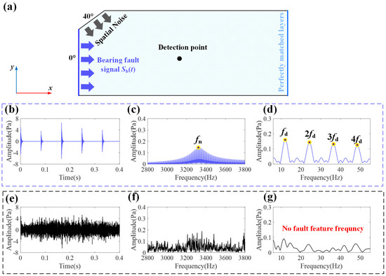 (a) Schematic of the propagation of bearing fault signals disturbed by spatial noise in 40° direction. (b) Time domain waveform, (c) frequency spectrum and (d) envelope spectrum diagram of the simulated bearing signal Sb(t). (e) Time domain waveform, (f) frequency spectrum and (g) envelope spectrum diagram of the detected bearing signal Sb(t) in the free field.