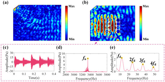 The designed line-defect PnC exhibits outstanding acoustic directional enhancement properties, offering significant advantages for detecting weak bearing fault signals. Figure 8a shows the absolute sound pressure distribution of bearing fault signals under spatial noise interference in the free field. It is evident that no valid information can be captured in the free field under strong noise interference. Figure 8b the corresponding sound pressure distribution of a weak bearing fault signal at the line-defect PnC under spatial noise interference. It is observed that the fault signal energy is concentrated at the center of the line-defect PnC detection point. Surprisingly, the line-defect PnC significantly suppresses noise interference, fully preserving the bearing’s fault impact characteristics and faint fault features while markedly amplifying the fault signatures, as shown in Figure 8d,e. Furthermore, comparing Figure 7d and Figure 8e reveals that the envelope spectrum of the online defect PnC detection not only successfully identifies the fault characteristic frequency fd and its harmonics but also exhibits amplitudes far exceeding those of the characteristic frequencies in the bearing fault signal itself. All findings confirm that the proposed line-defect PnC enables directional enhancement of weak sound sources in the target direction amid strong spatial noise interference, while retaining excellent directional gain. This structure thereby demonstrates significant potential for detecting faint acoustic signals.