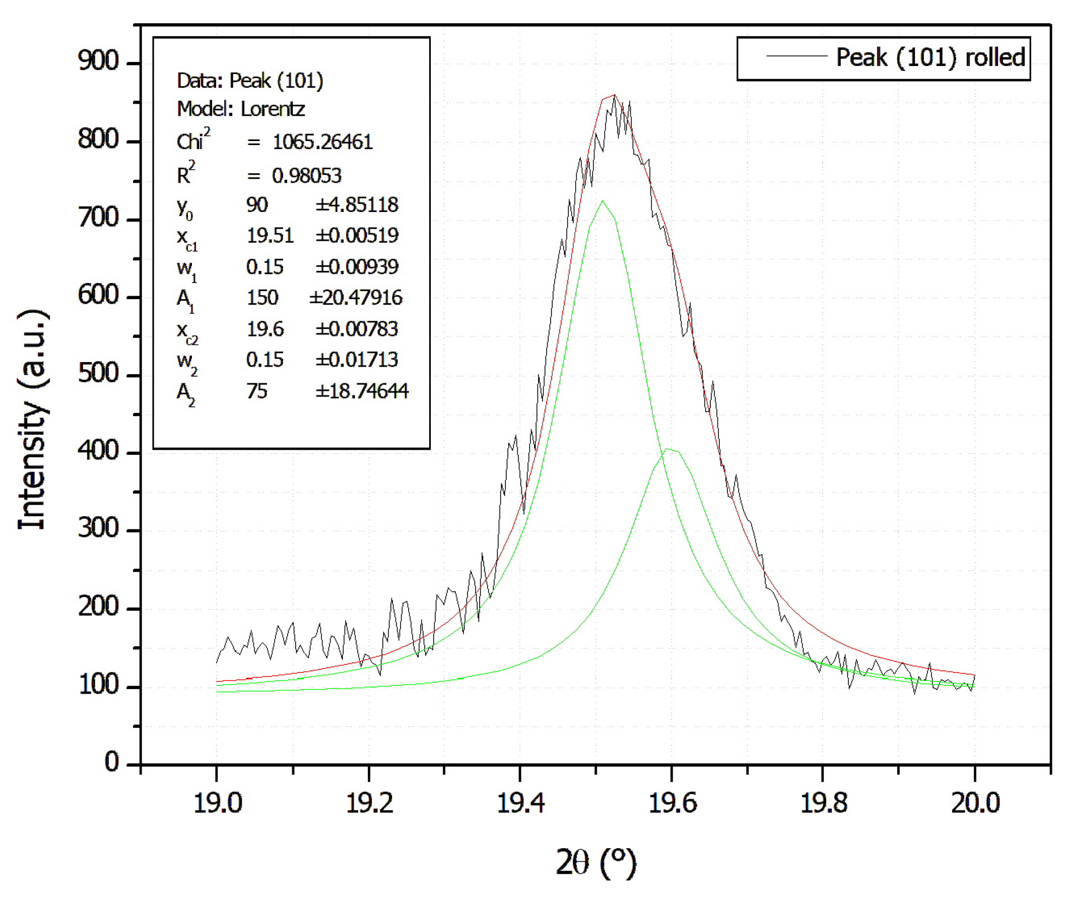 In both cases, rolling and tensile test, the phenomenon of recrystallization is evident and overlapped on work hardening. In fact, the dislocation density ξ is given by the sum of several factors, and recrystallization gives an opposite contribution to that of work hardening. So if one prevails over the other, a net decrease occurs. The difference of x between the rolled and after tensile test samples is ascribable to different contribution of DRX to the defect accumulation. Furthermore, the FWHM reduction may also be due to the different texture variation observed in the spectra of the two deformed samples. Moreover, as confirmed by the metallography, the phenomenon of recrystallization is present in both considered cases of plastic deformation.