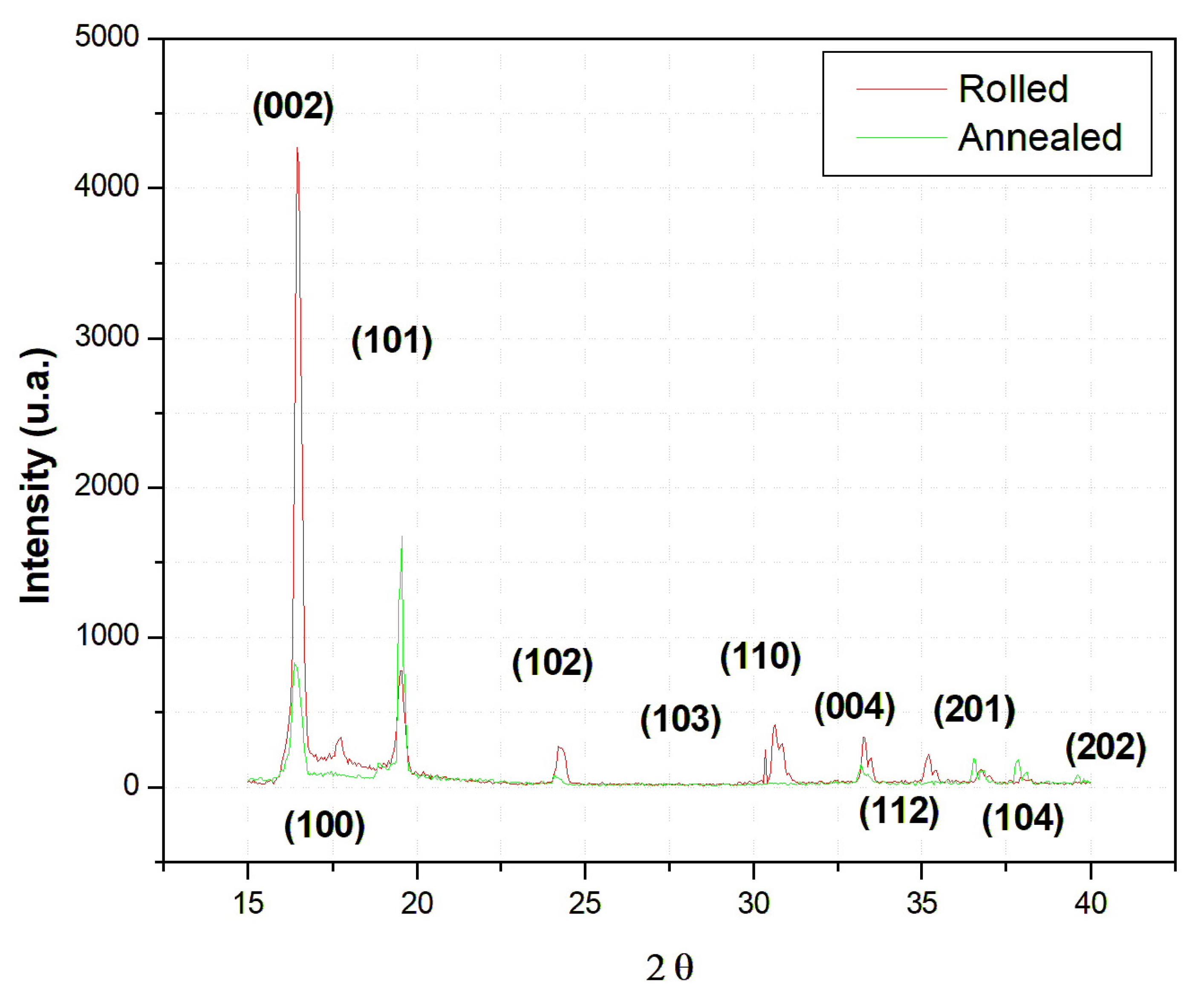 Table 2, texture strengthening can be highlighted by the comparison of the peak intensities. In particular, in the case of the tensile test sample, a variation in texture is evident, with the disappearance of the peaks (1 0 2) and (2 0 2) in comparison with the annealed sample, a significant reduction in intensity of the peaks (0 0 2), (2 0 1), and (1 0 4), and the appearance of the peaks (1 0 3), (1 1 0), and (200). The peak (101) remains the dominant reflection in samples after tensile test, whereas rolling enhances texture with (002) dominance.