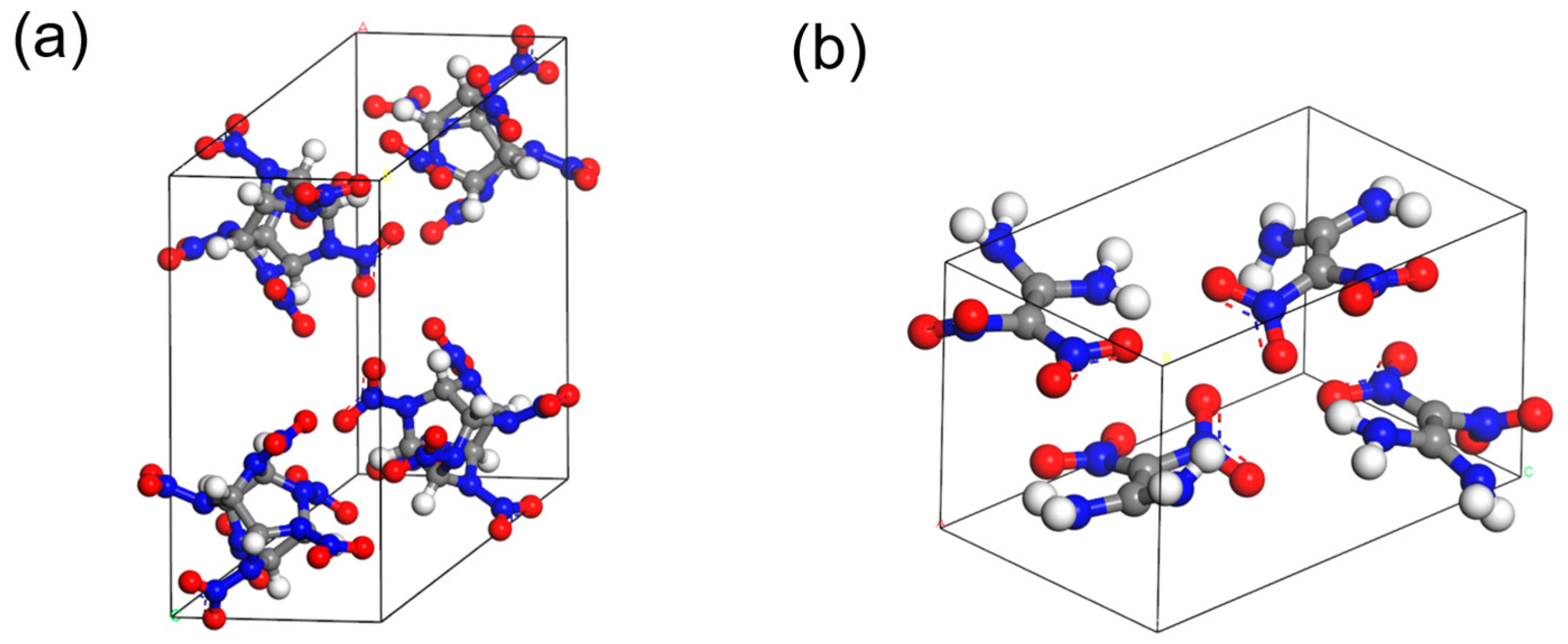 - Wu, Z.; Shu, Y.; Liu, N.; Ding, X.-Y.; Wu, M.-J.; Wang, K.; Wang, B.; Lu, Y.-Y. Molecular dynamics simulation of CL-20/FOX-7 eutectic. Chin. J. Explos. Propellants 2016, 39, 37–42. [Google Scholar]